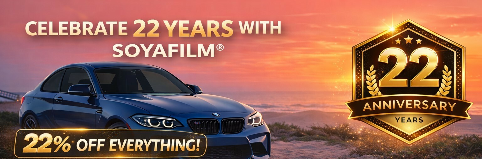 SOYAFILM® - Superenkel bilsolfilmVärldens Enklaste Solfilm för din bil!SOYAFILM® = 22år = 22% RABATT!från 218 SEK(Ord. Pris: 279 SEK)